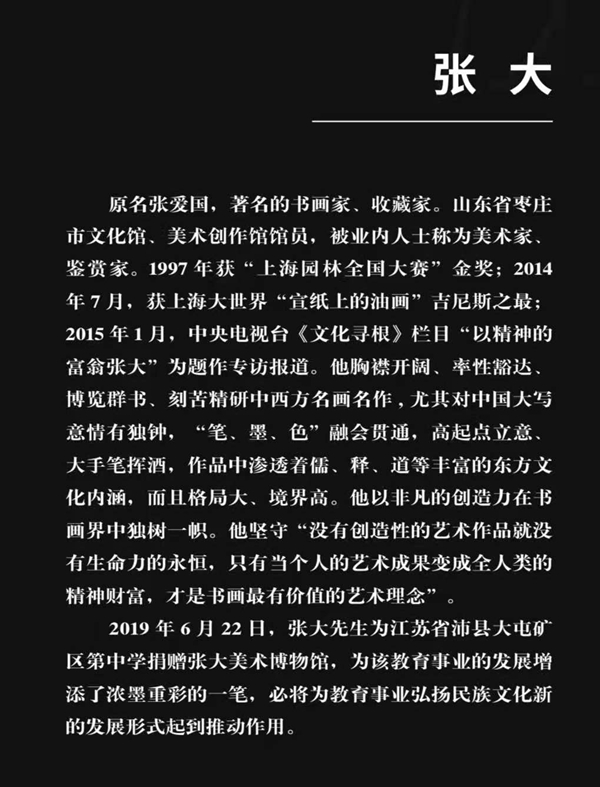 这次我们把张大的当代水墨作品引进上海展览,是对他对艺术的真诚和敬畏的一种表达和帮助;也是让他的作品放到上海甚至全国当代水墨平台上交流沟通,让更多的人认识他的艺术创作,认识他对艺术的虔诚和坚守;更是通过他的艺术作品展览认识他的收藏,认识他长期用心血积累的艺术宝藏。