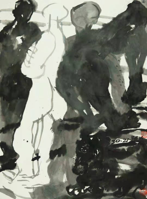 我认识张大时间并不长,先是从他的收藏的瓷器开始。一次偶然的机会到沛县大屯煤矿中学,这所学校和上海有着渊缘关系,听时任中学郑校长说,他们学校有个小型的瓷器収藏馆,一所中学有瓷器艺术博物馆,当即引起我的好奇心,当时就去观赏的瓷器陈列展,展厅并不大,展出经过断代分类的百来件作品之多,展示的瓷器脉络清晰,可不乏有精品陈列,听校长介绍这是一次偶然机会认识一位山东枣庄的收藏家,捐赠给学校400多件历代瓷器精品,他还介绍这位收藏家不仅收藏瓷器,书画,杂件收藏也很丰厚,这更引起了我们的兴趣,想请他过来一聚,郑校长介绍说这位张大先生一只脚走路不便,不知是否能来,当对方听说我们是上海来的艺术家,很爽快的答应来见面,并带来有关上海艺术家的一些藏品让我们砌磋欣赏。见面聊天中才知道他也是一位艺术家搞当代水墨创作,有了一面之缘,就有了第二次、第三次的见面,特别是对他的当代水墨画有一个惊喜的发现。去年春节前他在朋友圈里发了几张小的水墨人体,作品透露出大胆、当代,没有古人、今人的水墨迹象和影子,感觉到一种水墨的力量和震撼。当即有了给他举办当代水墨画展的念头,把他的作品引进到上海当代艺术舞台来交流。