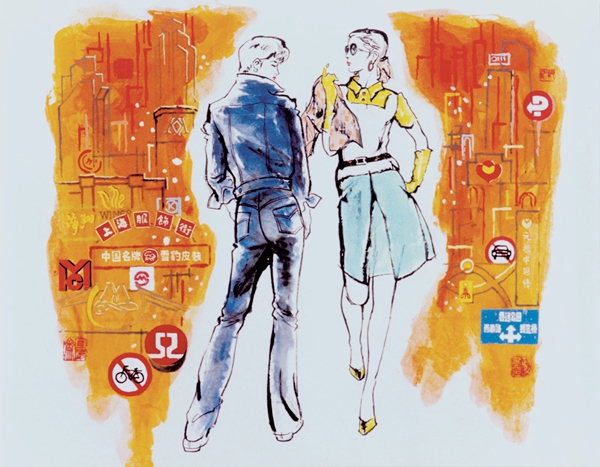 为使画面上人物的线条流畅而倏忽变化,借鉴了速写线条,笔墨顿挫的技巧,从而使人物充满运动感和韵律感,表现出现代大都市的快节奏生活。周遭建筑物的线条则刻板而硬直,这有助于与人物流畅的线条形成鲜明的反差和对比。夜景中光怪陆离的霓虹灯与日景中的各种交通标志和公司司标,不仅烘托了现代大都市的氛围和情调,还隐喻都市节律的板滞和对人性的拘味。现代都市人尽管整天在冷漠的水泥建筑中穿梭,受到各种警戒的约束,但从他们疾走如风,衣袂飘举的动态中,我们不难感悟到现代都市生活的快节奏。正是这种快节奏,使现代大都市一年一个样,三年大变样!