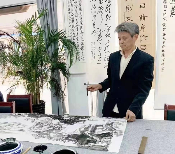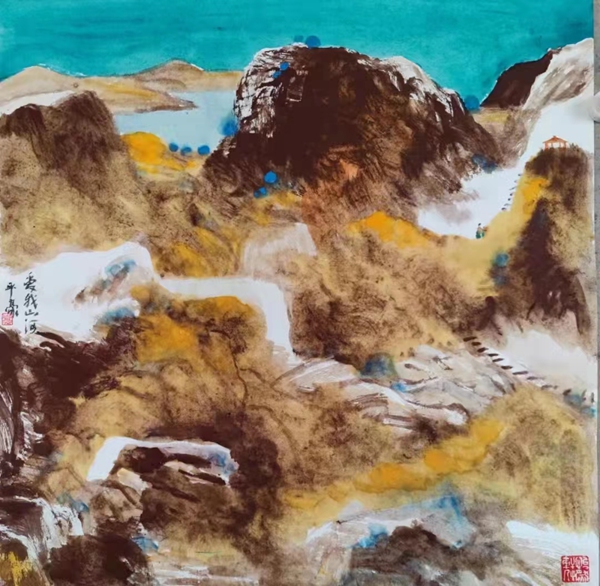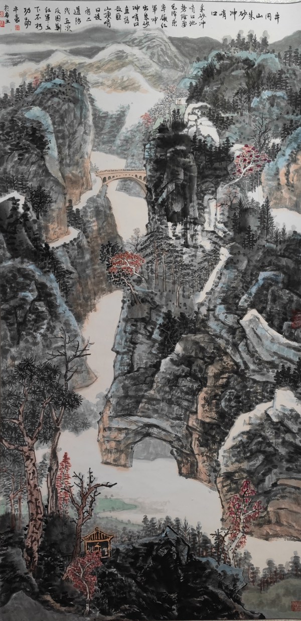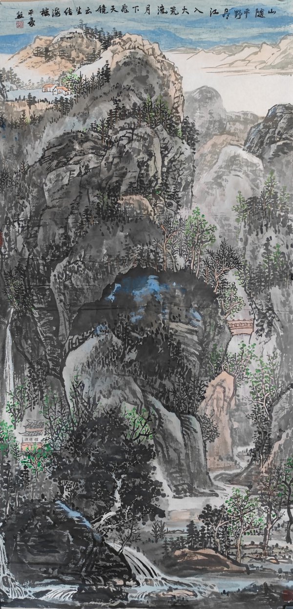 平豪的山水十分开阔,旷野之中又十分静幽,何以将两者如此融合,其诀在笔。山水画的笔势在近现代受西画色彩烘染弱化了笔气,也就是山水画本身以笔写山做高古大文章。平豪拿得起这枝笔,千山万壑,笔笔入势,纵横交织气韵生动,这样的山就非常壮美,唐宋山水以笔势为先,唐诗宋词以格局为气,都探究艺术造景的本体,所谓笔不掩山,彰显神韵,气韵入骨,这样以笔营造的山就葱俊万芳。平豪的山水画以山势做文章,如果你是行家里手,观平豪用笔,笔气敦厚,层层互映,一派江山如此多娇。所以,平豪画山水很早就出名了,上世纪八十年代初正是中国山水在前辈现实主义精神关照下,在开放的氛围之中研究山水画本体,平豪又从萧海春先生,更是如鱼得水,他那时对宋元山水的研习不仅是对范宽、王蒙的研究,更是把开放时代中国人重新焕发的宽泛胸怀和对传承的再认识,一画宋元朗润春华,高古绚烂,平豪时有佳作与那些前辈同时展览。