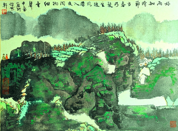 这几年,上海中国画坛进入中年的国画家大多很沉稳,山水画在他们看来更重笔墨的涵养。从这幅画中我们可以看出平豪将王蒙与龚贤的山水画融合,这本是用笔姿在做春山的大文章,又以小青绿衬托其神,这样一幅春景就显出春光无限的魅力。真如艺术大理论家所讲的,现当代的山水就是散文的笔调描活富春山居图,上溯古风,下拥生活气息,平豪领会其神。所以,这几年,平豪的山水画创作有着显著的进步,我想这也是平豪将深情的笔墨升华到修养的原因。