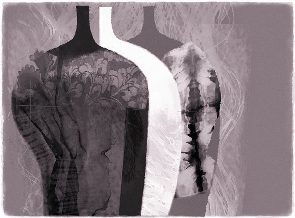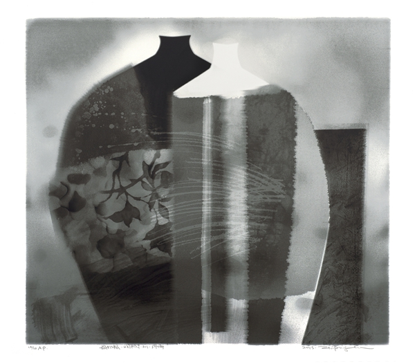 细数卢兄的《瓶非瓶》、《当代容器》、《润物无声》和《内敛的灰色系列》这几个系列作品,都无一例外地是以“瓶”或者它的局部形态,作为主要的形象素材的;而在更早期的铜版画作品和《灰色的五言与七律》系列中,“瓶”的形态也屡屡出现。另从时间的角度讲,可看到他在涉足版画创作的三十余年中,与“瓶”的对话,就占了足足十几年的光阴。