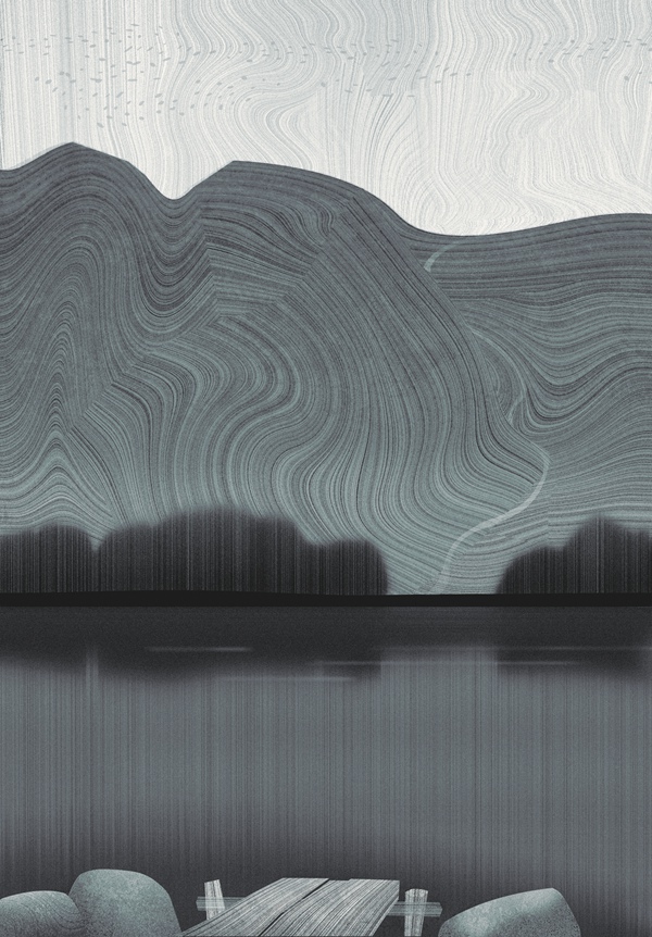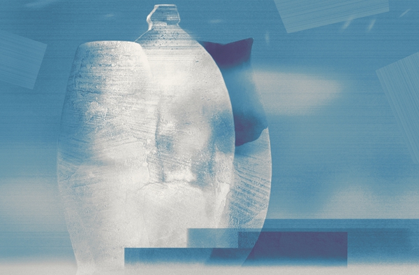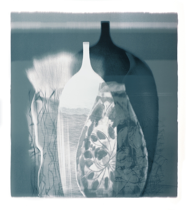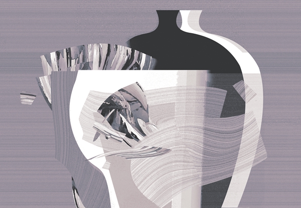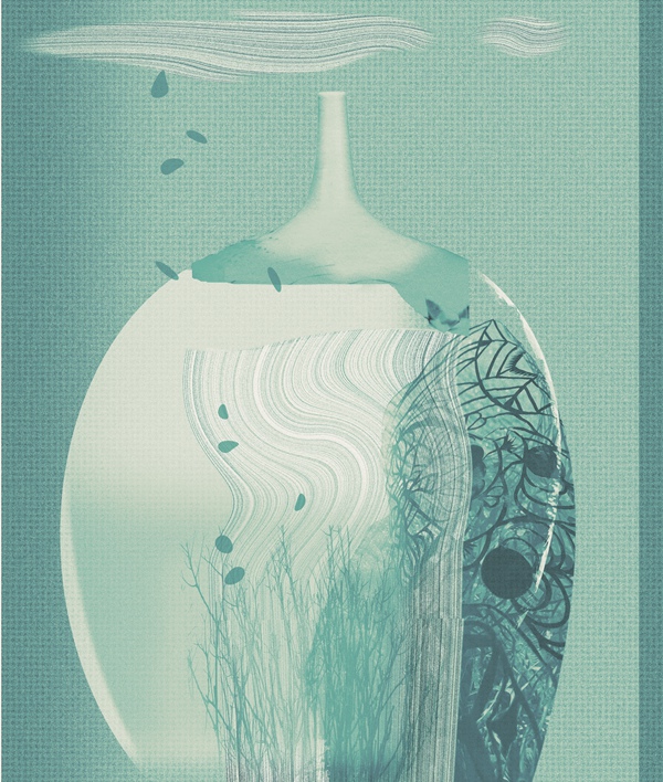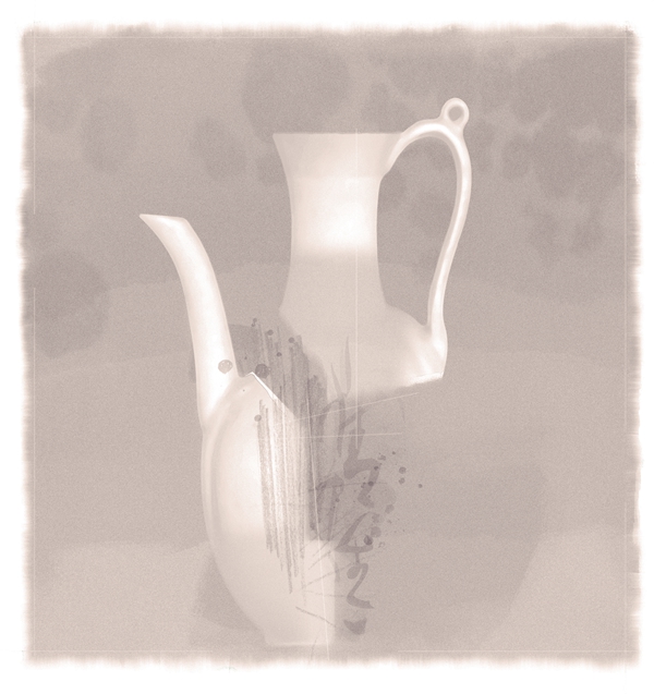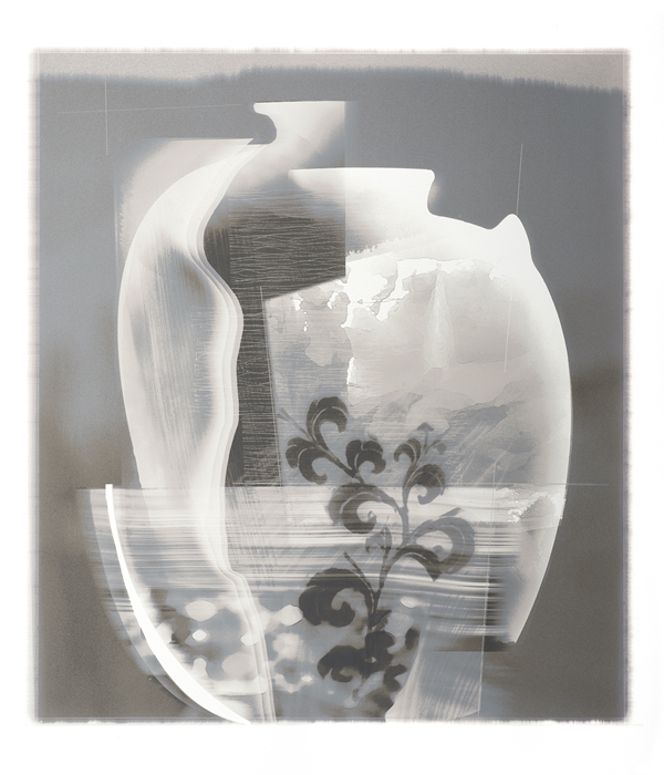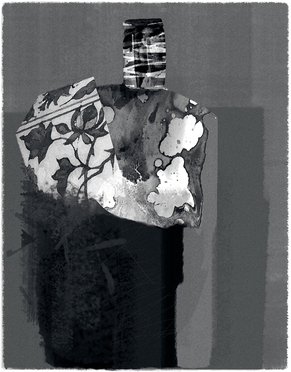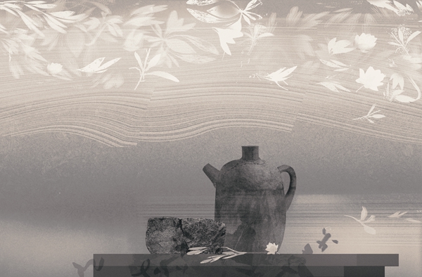 显而易见地,他的作品所关涉到的,是中国的视觉文化传统。中国的传统文化,是难以用简要的辞语来阐释或把握的、庞大而复杂的体系;即使单举其中的视觉艺术门类的审美样式,也同样是包罗万象、浩瀚如烟海,环肥燕瘦般地众彩纷呈。显然,卢兄并不想以上帝的视角,来俯瞰和诠释这片锦绣般璀璨的缤纷图卷。从他选择的器型、纹饰的内容和风格,以及画面色调的处理来看,他所钟意的“传统”,是平和、恬淡、静谧那一路的审美取向。这个取向的代表,就是古代中国画中以丰富的水墨层次、即所谓“墨分五色”的方式来营造的,可以在俯仰间神游山川宇宙、悟道怡神养心的纯净世界。
