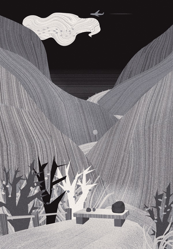 他的瓶,多选择的是器形简洁规整而伸曲收放有度的一类,口小而腹肥,自具含蓄的张力,更具有包容的肚量。在这个有肚量的容器里,他放置了诸如云霞、山川、草木、花卉的形象。这些形象经常带有程度不同的装饰化风格,仿佛它们本就是瓶的装饰纹样;而它们与瓶体形态的错位游离,却又会让人怀疑这一点。这个若即若离的处理,就像是把“瓶”这个简明物象作为一个入口,带人旋即进入更广大的想象空间。就如卢兄自己说的:“我从没有想过要画一个真实的可以触摸的瓶子,借题发挥而已”,也就是说,在可视的“瓶”之外,他另有寄托。