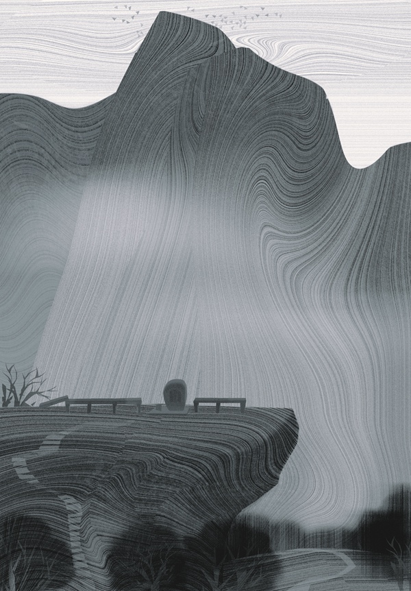 新系列《坐领风物》,是卢兄的在图式上的一个突变,意外之余,也让我为“瓶”就是卢兄内心世界的外化的这个看法,找到了新的佐证。我自作主张地以为,这些画面里以端坐或伫立的姿态,直面山川天宇的那些有如石墩、或是石碑的团块形态,其实就是先前那些“瓶”的化身,只是它们变小了。假如说,此前的它们,是作为画面的主要视觉形象,吸引观众进入其内部的审美幻境;那么如今,它们则凝缩成作品中“画眼”式的坚实存在,谦虚地观照大千,也把大家的视线,引向了外部风物景观的、依然是在“灰灰的,湿润的色调”里不断铺展开来的宁静、明澈和幽远。